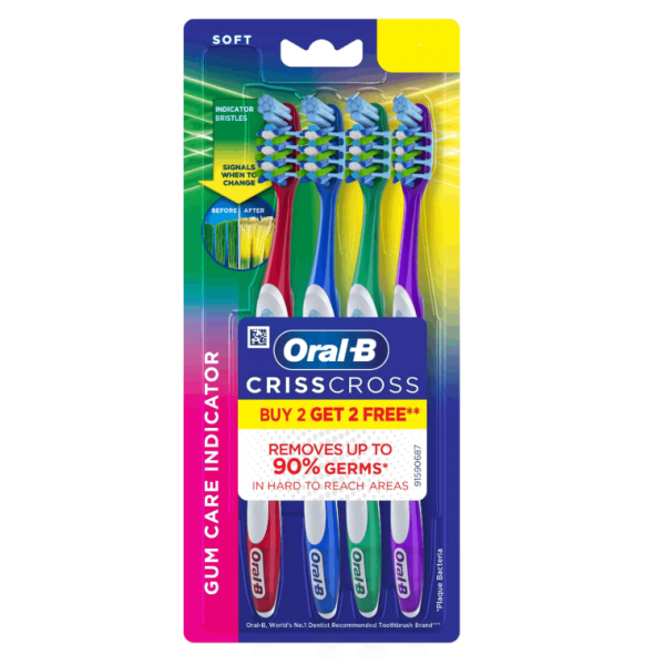 Angled at 15° in opposing directions, CrissCross bristles are designed to flex and then straighten, actively penetrating between the teeth and along the gum line to lift and sweep plaque away
